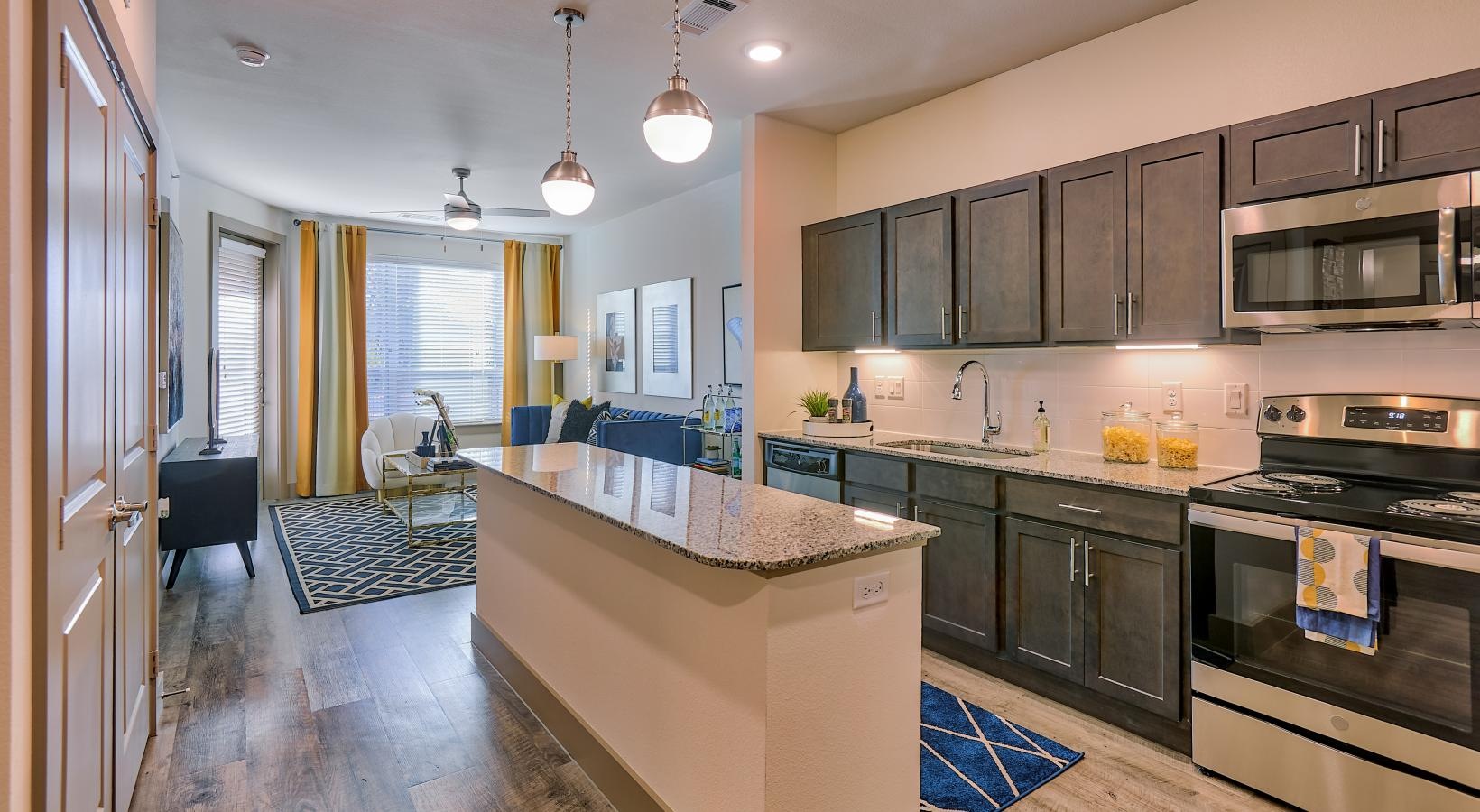 Tower Bay residents will appreciate breathtaking one and two bedroom apartment homes that offer expansive, open floor plans with natural light and lofty 9' ceilings. Modern design features include wood vinyl plank flooring, granite counters, gourmet kitchens with pantry closets, plush carpet in bedrooms, over-sized soaker tubs, spacious walk-in closets, energy star rated appliances and private patios or balconies. Select homes feature island kitchens with a breakfast bar, double sink vanities, shower stalls and built-in bookshelves and desks.